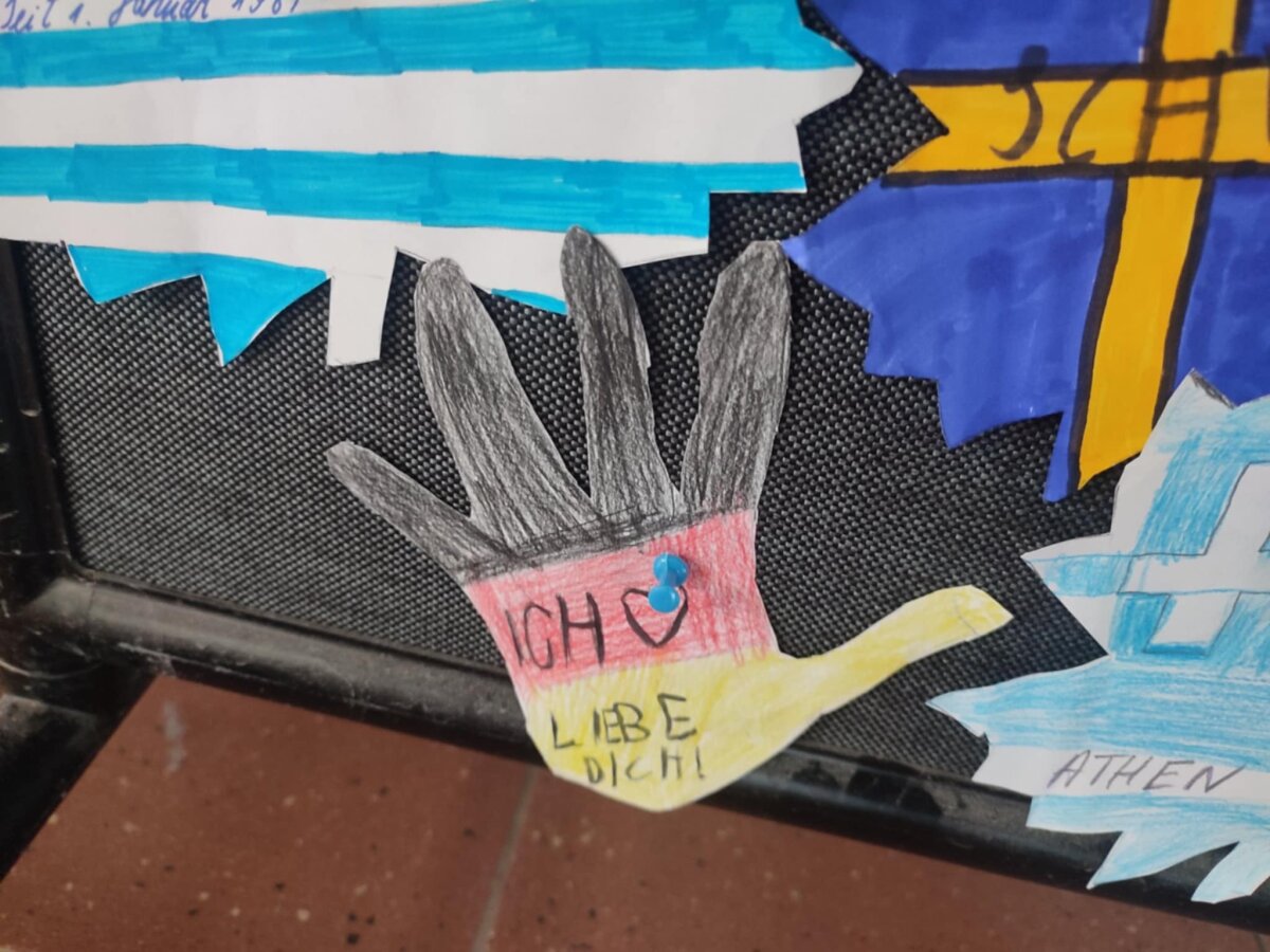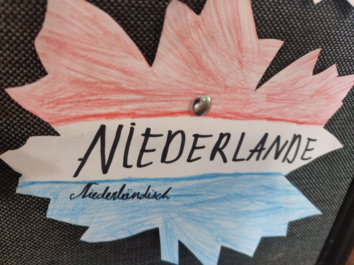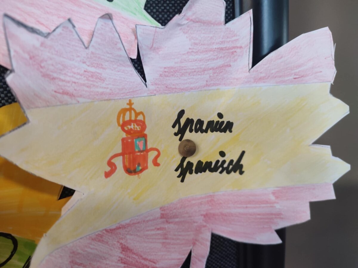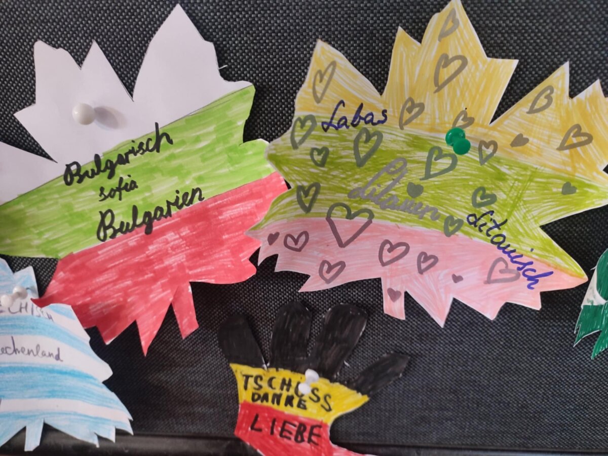 Pradinių klasių mokiniai baltą klevo lapą papuošė įvairių šalių vėliavomis, pasisveikinimo žodžiais bei tų šalių simboliais.