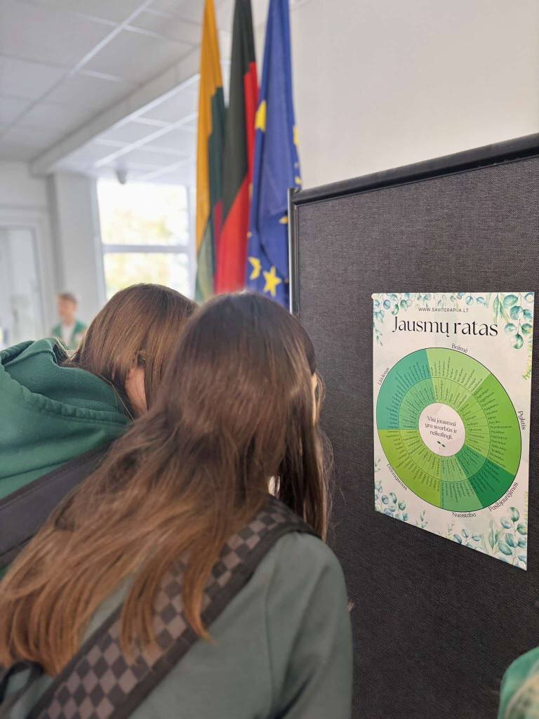 Spalio 8 d. mokiniai ir mokytojai stabtelėjo prie jausmų rato, įsiklausė į save ir bandė įvardinti, kokie jausmai šiuo metu juos lydi. Jie pildė savijautos klausimyną, padėjusį geriau suprasti savo emocinę būseną ir pagalvoti, kada verta pasikalbėti ar kreiptis pagalbos, jei savijauta prastėja. Po šios refleksijos mokiniai vaišinosi ne tik saldumynais, bet ir maža užduotimi sau ar kitam – padėka, šiltu žodžiu ar geru palinkėjimu.