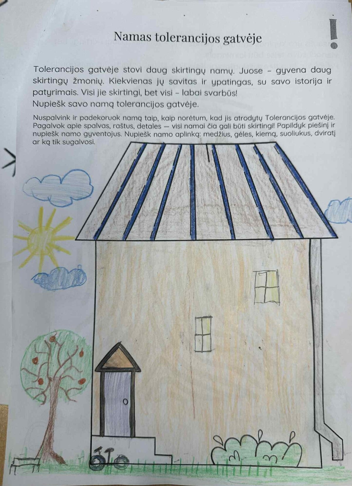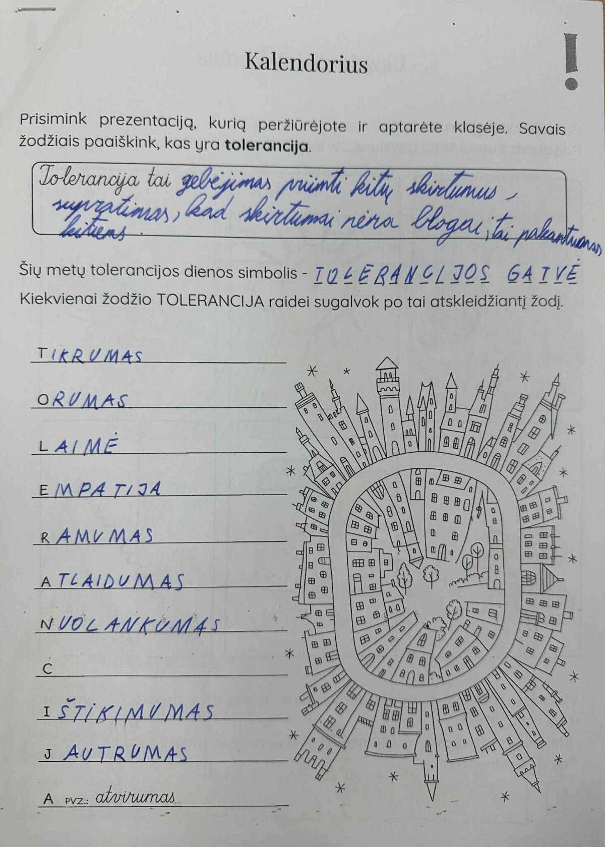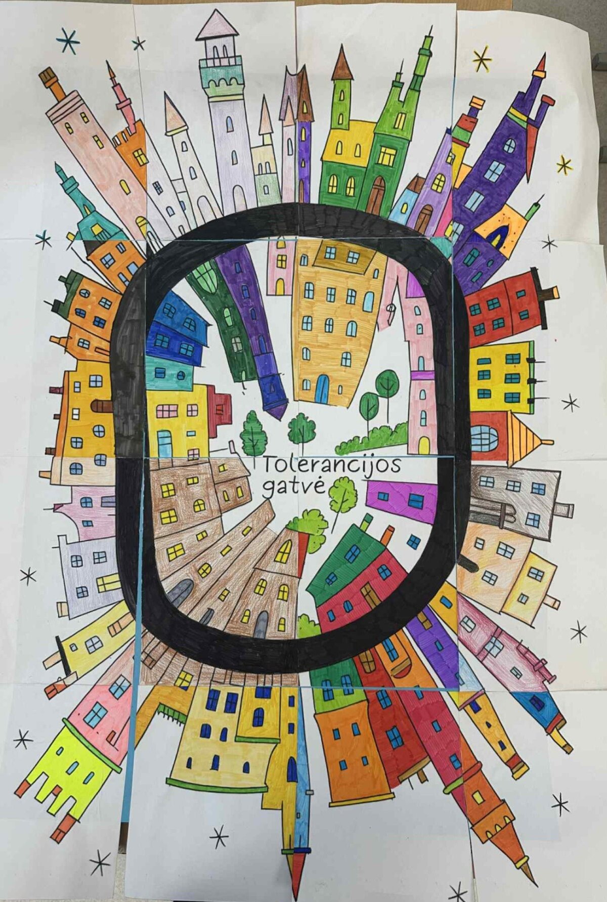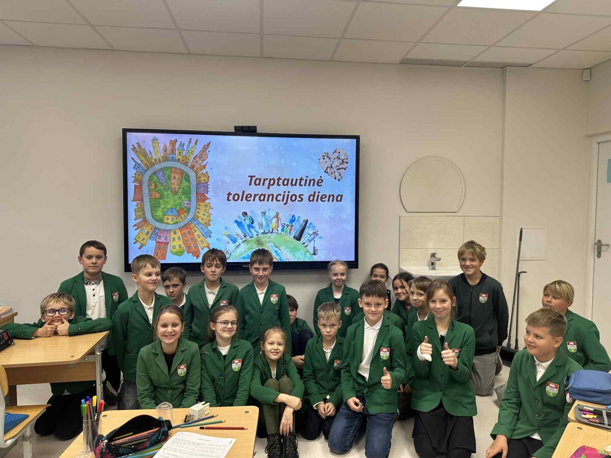 Lapkričio 14 d. 4b klasės mokiniai kartu su mokytoja savo klasėje paminėjo artėjančią Tolerancijos dieną. Atliko įvairias užduotis ir visi kartu sukūrė savo klasės Tolerancijos gatvę, kurioje stovi daug namų, kuriuose gyvena ypatingi žmonės.