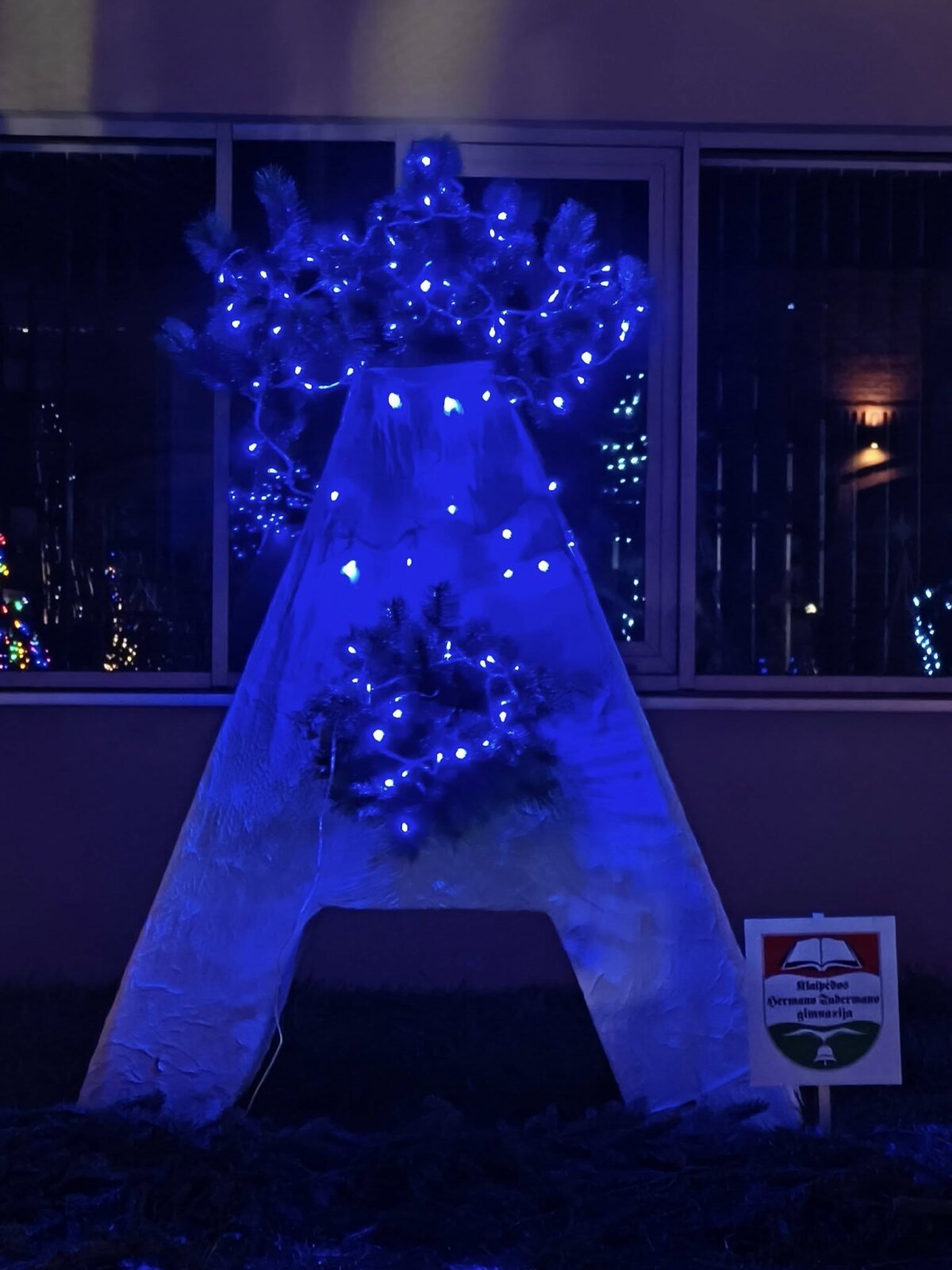 Hermano Zudermano gimnazijos Kalėdų eglutės idėja - A yra abėcėlės pirmoji raidė (biblioteka- knygų pasaulis) ir pasirinkta stichija - vanduo (Klaipėda - miestas prie jūros).