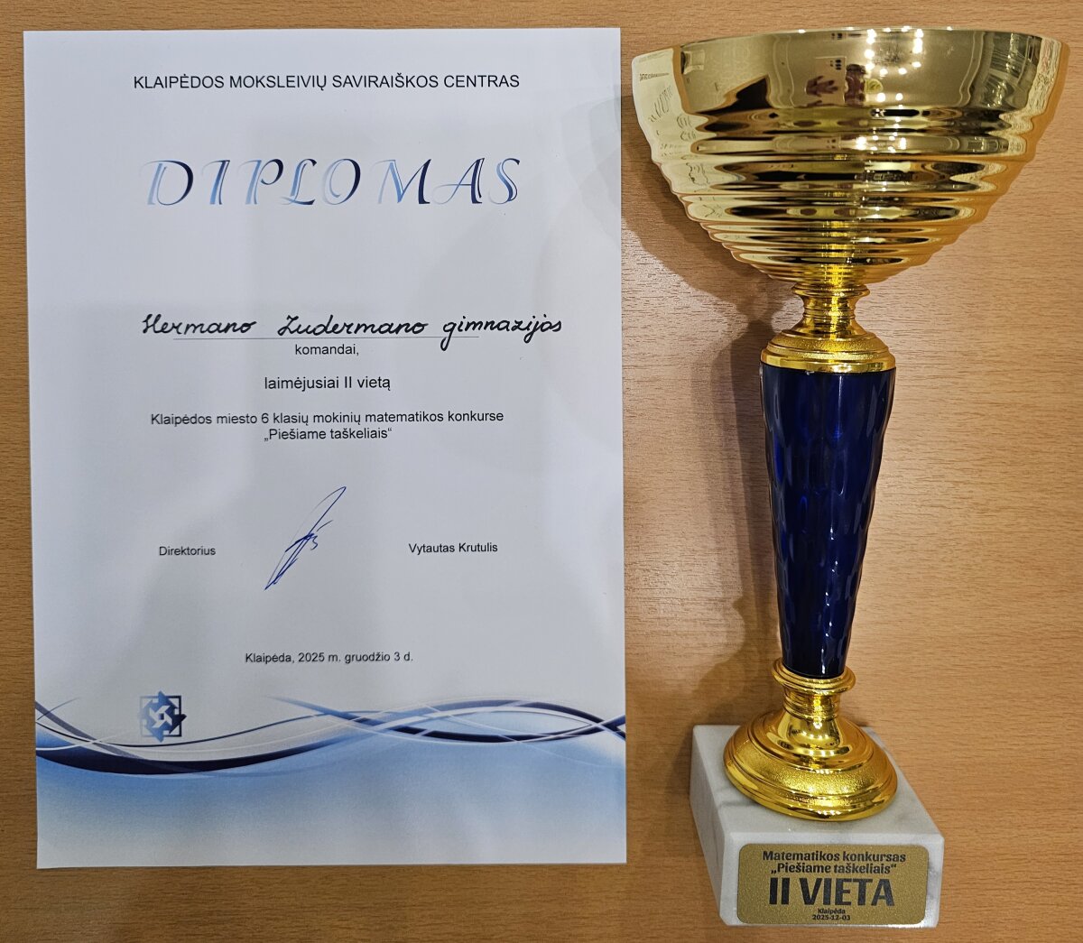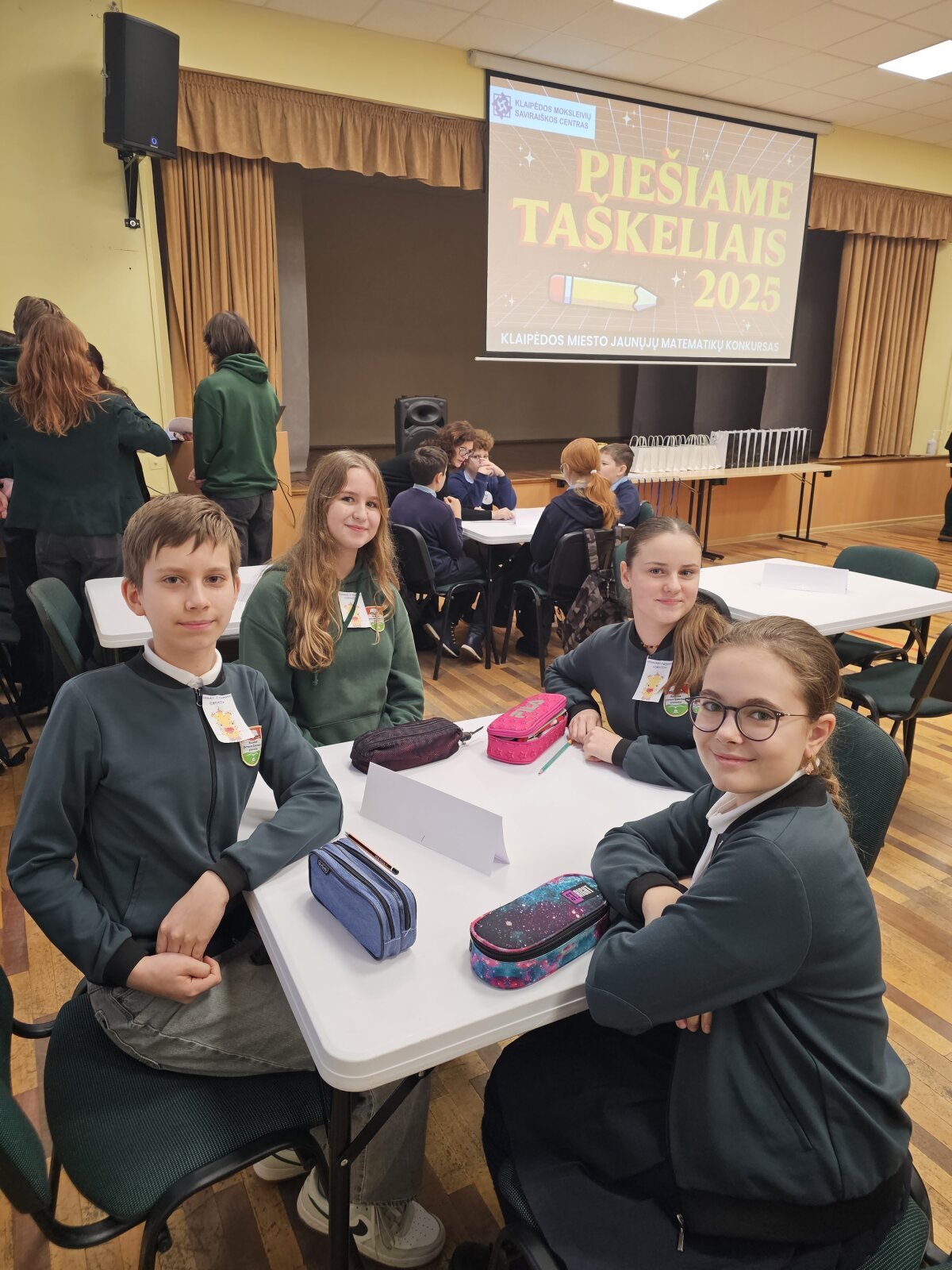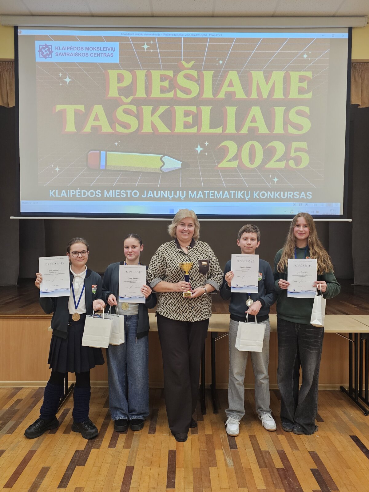 Gruodžio 3d. Klaipėdos moksleivių saviraiškos centre vyko miesto 6-tų klasių mokinių matematikos konkursas „Piešiame taškeliais“. Mūsų gimnazijos šeštokų komanda laimėjo II vietą iš 12 konkurse dalyvavusių komandų. Gimnazijos komandai atstovavo: Tėja Korsakaitė (6a), Liepa Macevičiūtė (6b), Augustė Sendriūtė (6b) ir Augustas Venslovas (6b). Sveikiname šauniuosius šeštokus!