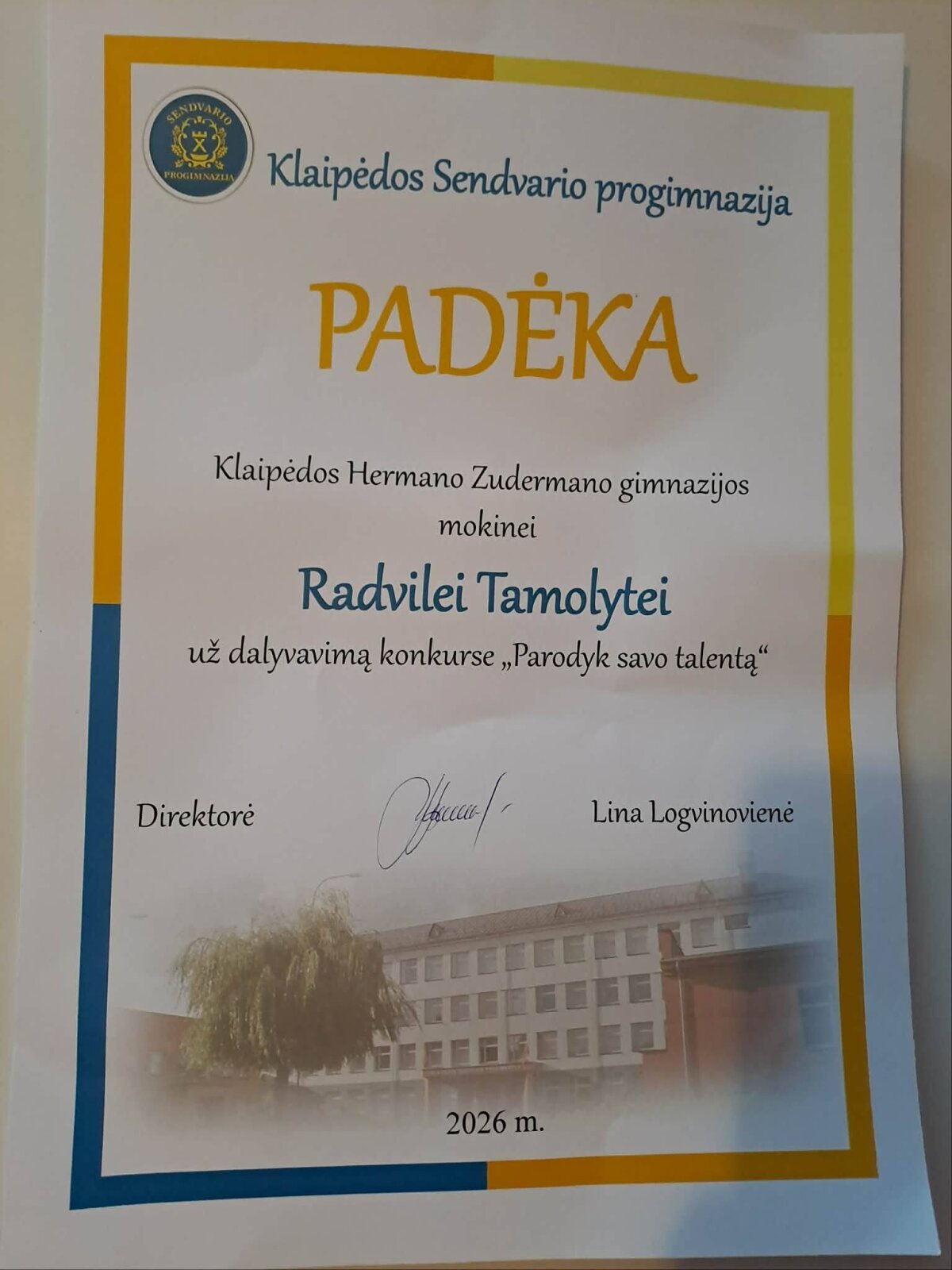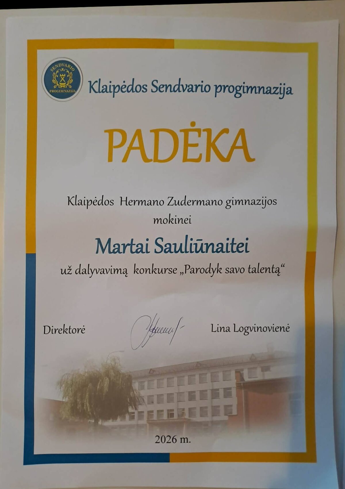 Vasario 12 dieną Klaipėdos Sendvario progimnazijoje įvyko tikrai gražus ir mokinių kūrybiškumo ugdymui svarbus renginys "Parodyk savo talentą". Jame dalyvavo penkiolikos Klaipėdos bendrojo lavinimo mokyklų jaunieji talentai. Hermano Zudermano gimnazijai atstovavo 7a klasės mokinės Marta Sauliūnaitė ir Radvilė Tamolytė. Šventiškai nusiteikę renginio dalyviai atliko įvairius muzikinius kūrinius, skambėjo poezija, liejosi šokio ritmai. Šventės pabaigoje visi dalyviai buvo apdovanoti padėkomis ir asmeninėmis dovanėlėmis.