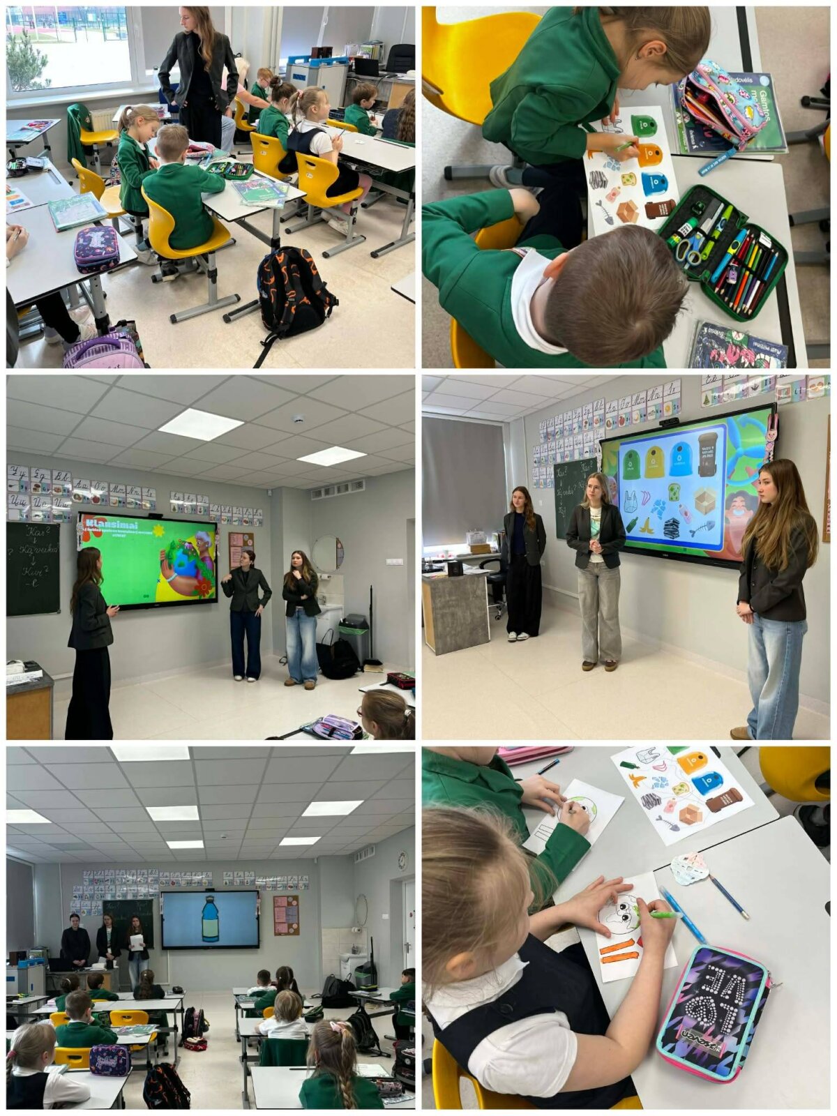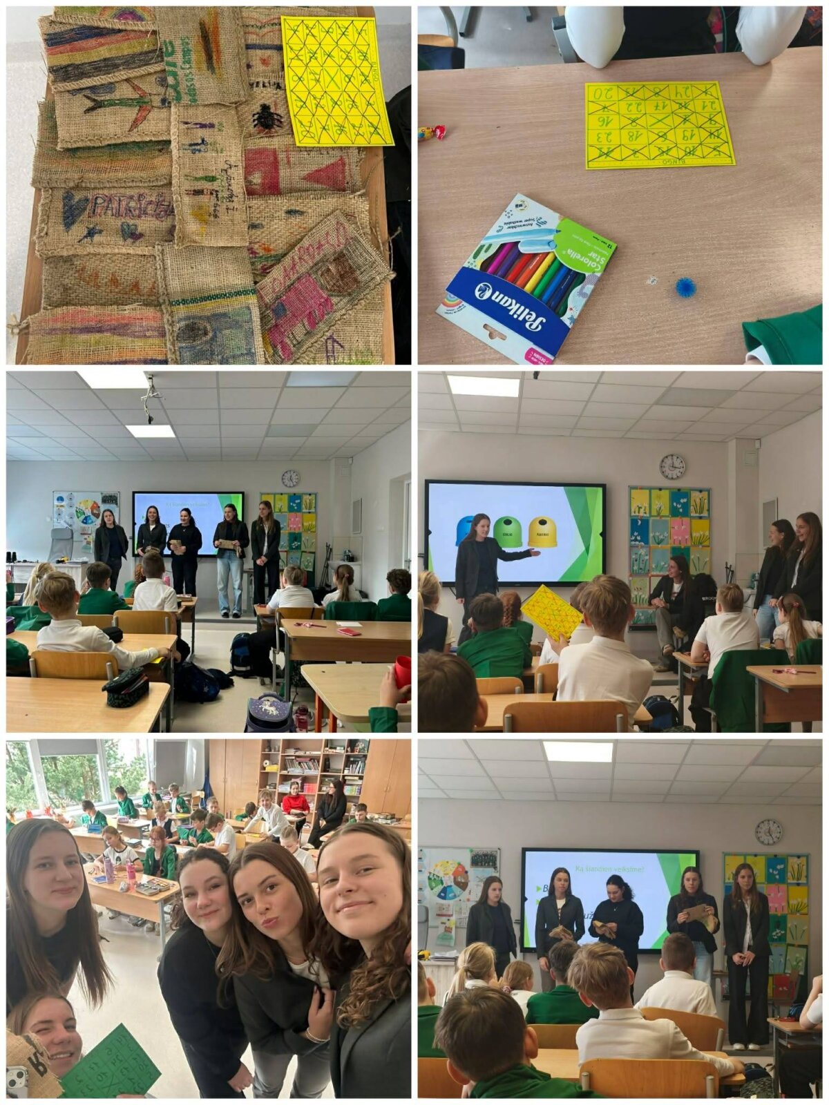 Kovo 10 dieną, 10B klasės mokinės Beatričė, Rusnė, Tija, Kamilė ir Karina, komanda "Tvaručiai", mūsų gimnazijos trečiokams vedė pamoką apie rūšiavimą ir atliekų prevenciją. Taip pat kaip galima iš naujo panaudoti atliekas - vaikai iš panaudotų kavos maišų gaminosi penalines, kurios bus draugiškos aplinkai.