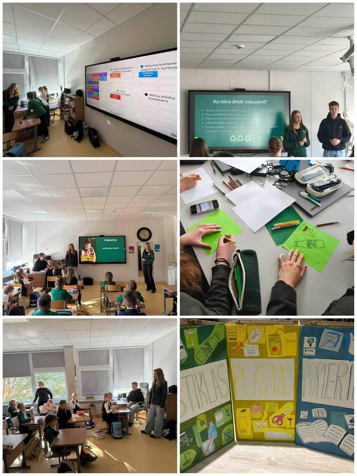 Kitą devyntokų komanda "Tvarieji", Deimilė Miciūtė, Kipras Stasiulis, Elzė Gindulytė ir Danius Paškevičius pradinių klasių mokiniams pristatė temą apie atliekų rūšiavimą, jie buvo supažindinti su skirtingų atliekų rūšių tipais, sužinojo į kokius konteinerius jas reikia mesti, kodėl svarbu saugoti aplinką, veikla vyko interaktyviai, mokiniai aktyviai atsakinėjo į klausimus. Vyresniems mokiniams gimnazistams tema buvo nagrinėjama plačiau, jie gilino žinias apie rūšiavimo svarbą, diskutavo apie aplinkosaugą, dalyvavo smagiame „Kahoot“ žaidime, kuriame pasitikrino savo žinias. Pabaigoje dirbo grupėse, iš kartoninių dėžių kūrė rūšiavimo konteinerių modelius, juos dekoravome, dažėme, ir taip pat stengemės pritaikyti savo žinias. Sukurti rūšiavimo konteineriai bus naudojami biologijos kabinete. Ateityje mokinių ruoštų konteinerių atsiras visoje mokykloje.