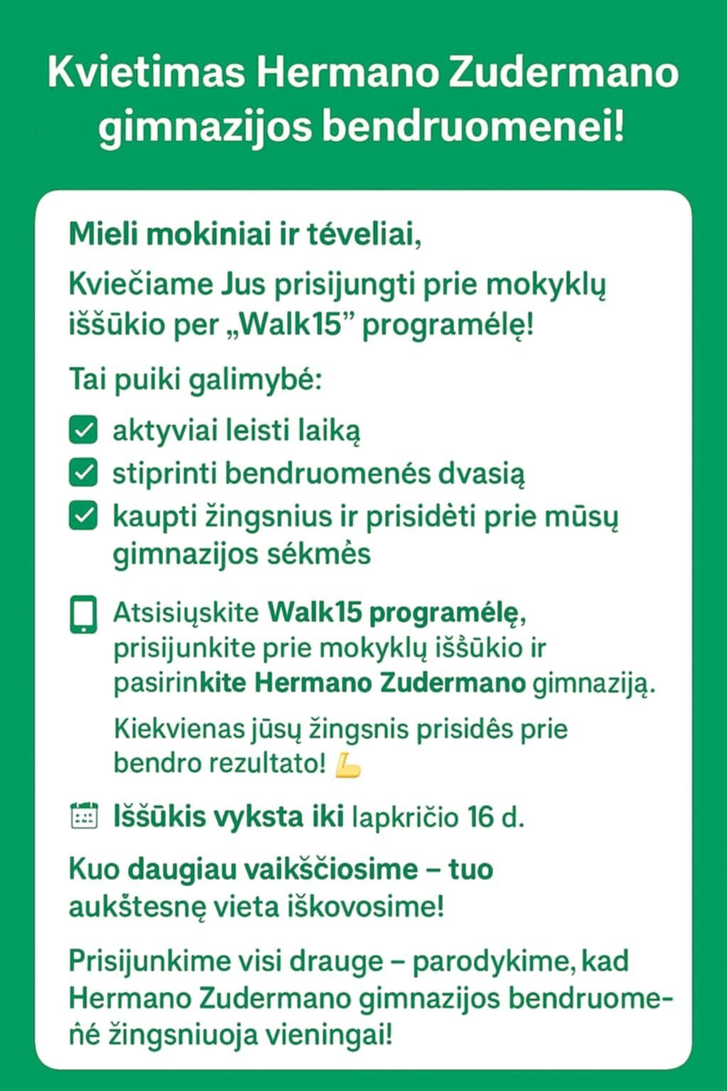 Jei turi #walk15 programėlę, spausk šią nuorodą https://walk15.app/challenge/code/Mokyklos2025 ir priimk iššūkį!
